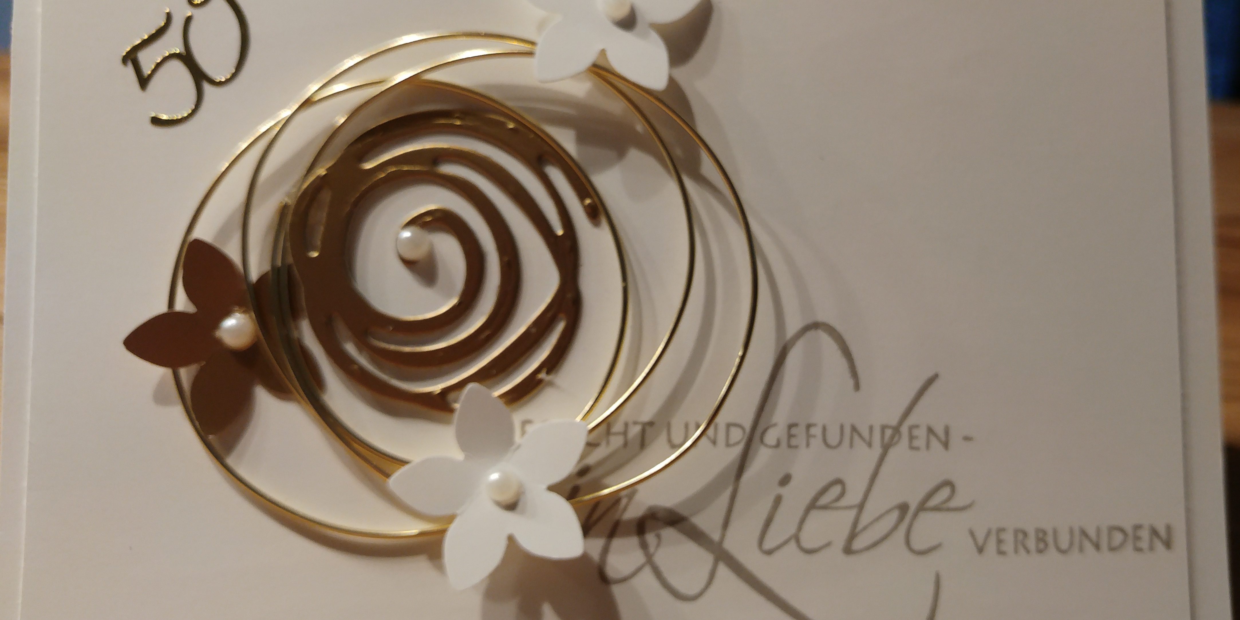 Für eine liebe Kollegin habe ich 2 Karten zur Goldenen Hochzeit zur Auswahl gebastelt, da sie meine in weiß gehaltenen Hochzeitskarten so schön fand, habe ich diese nur etwas mit „Goldeffekten“ abgewandelt: