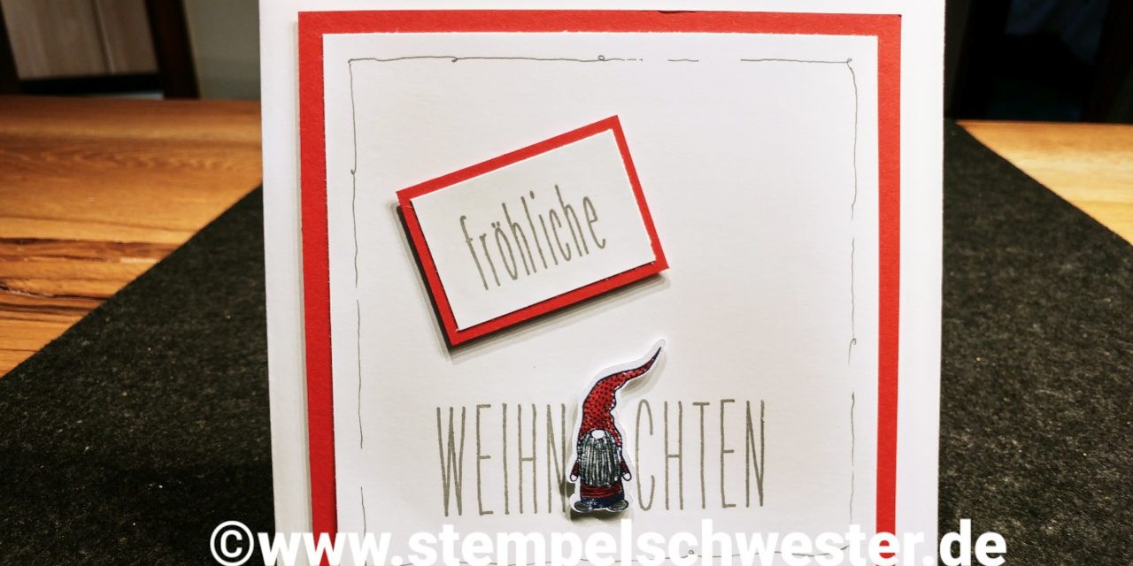 Freihändig habe ich jeweils noch eine feine Linie in rot bzw. grau als Umrandung gezogen. Den Schriftzug „Weihn chten“ habe ich hier noch in rot embossed. Eine weitere Wichtel-Weihnachtskarte ist mit rotweißem Band und einem Stern verziert: