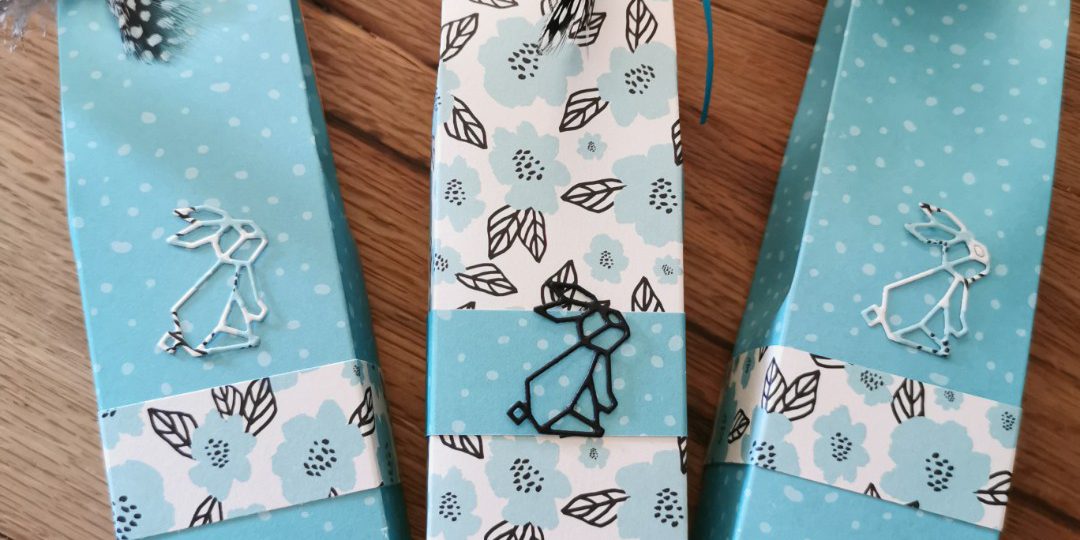 Schnell und einfach ist diese Verpackung für eine Tube Handcreme gebastelt. Ihr benötigt nur einen Farbkarton in der Größe 25 x 22 cm und etwas Material zum Verzieren. Ich habe noch etwas Kontrastpapier, etwas Band und ein paar Federn verwendet – passend zu Ostern ;-).