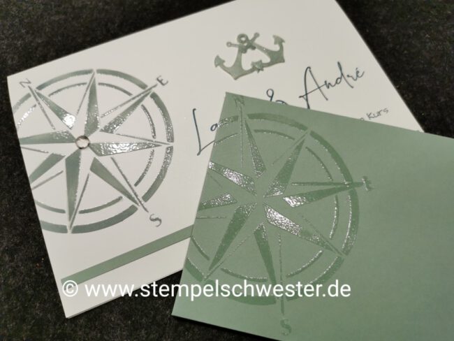 Maritime Hochzeitskarte Im Kollegenkreis wurde geheiratet und ich durfte eine Hochzeitskarte gestalten. Da ich weiß, dass das Brautpaar das Meer oder die See liebt, habe ich mich für maritime Elemente entschieden: Statt Ringe kamen 2 Anker zum Einsatz. Die Schablone für die Kompassrose habe ich selbst geplottert. Die gewischte Stempelfarbe ( Distress Oxide weathered wood)…