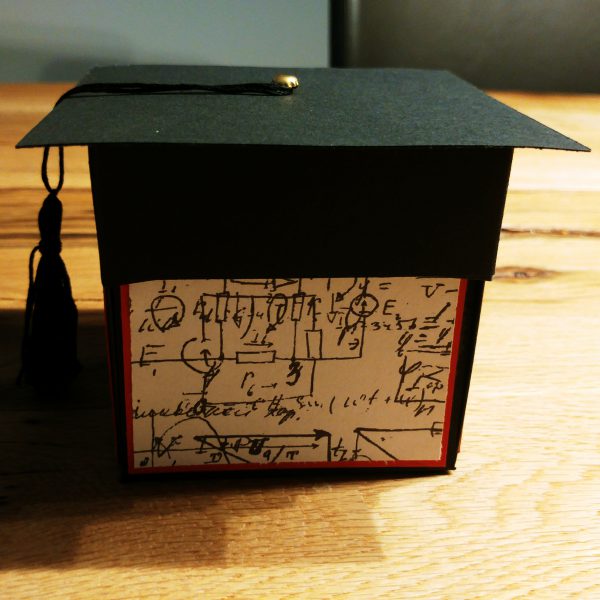 Meine Explosionsboxen haben meist das Maß 10 x 10 x 10cm. Sowohl die Innen- als auch die Außenseiten werden verziert. Am Anfang steht das Aussuchen des Papiers, das mich immer am meisten Schweiß kostet. Dann das Dekorieren der Seitenwände und die Überlegung, was auf den Deckel soll. Insgesamt sitze ich ca. 3 Stunden an einer Box, manchmal bis zu 5 Stunden, wenn ein Auto, ein Koffer oder eine kleine Torte gebastelt werden soll oder etwas ähnlich Aufwändiges…